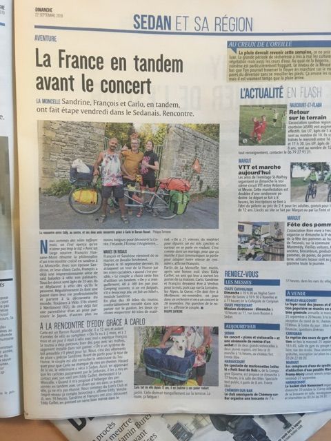 Voici l'article de L'Union - L'Ardennais rédigé par Philippe, journaliste et féru de vélos, surtout les très vieux vélos, qu'on a croisé prêt de Sedan (à La Moncelle)! On notera surtout le zoom sur Carlo dans son panier. La classe!