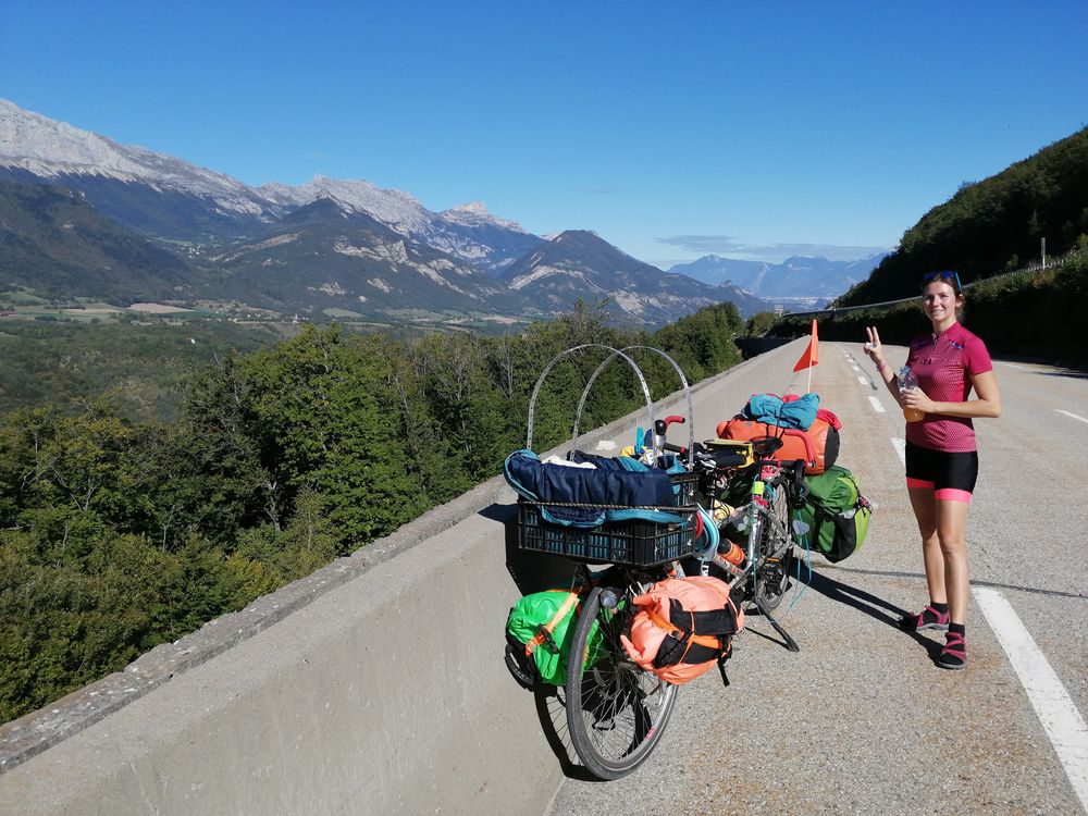 On croise rapidement Christelle au réveil. Une fois chargé, on fait le plein de pâtisseries à la boulangerie en bas de l'immeuble, sur les conseils avisés de Christelle et Simon, et nous reprenons la route. La sortie de Grenoble se fait par une grosse départementale qui est pourvue d'une bonne piste cyclable sur 10km. Ensuite on suit une petite rivière sur 5km jusque la ville de Vif où l'on achètera un paquet de réglisse au petit Casino. Aujourd'hui, il fait très beau, pas un nuage et il fait chaud. On a donc des vues magnifiques sur les trois massifs montagneux entourant Grenoble.