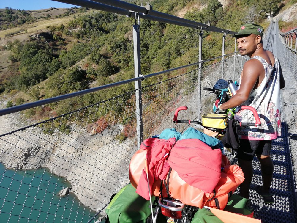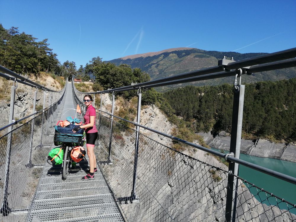 On achètera quelques cannettes dans un bar de Sinard et nous nous laisserons descendre jusqu'au lac de Monteynard. Arrivés au lac, les choses se compliquent (si si on peut faire pire). On a choisi de passer par deux passerelles himalayennes d'une centaine de mètres au-dessus des lacs d'Ebron et du Drac. Et on a eu raison, c'est époustouflant. Mais l'accès est complètement fou, c'est en pleine forêt, il n'y a pas de route et on a des pentes jusque 15%!!! Autant dire qu'on a beaucoup poussé et que même comme ça on en a chié.